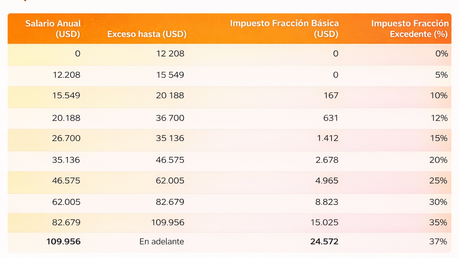 La tabla publicada establece tramos de ingresos con tarifas progresivas que van desde el 0% hasta el 37%, dependiendo del nivel de renta anual. A cada fracción básica se le asigna un impuesto fijo y un porcentaje aplicado al excedente.