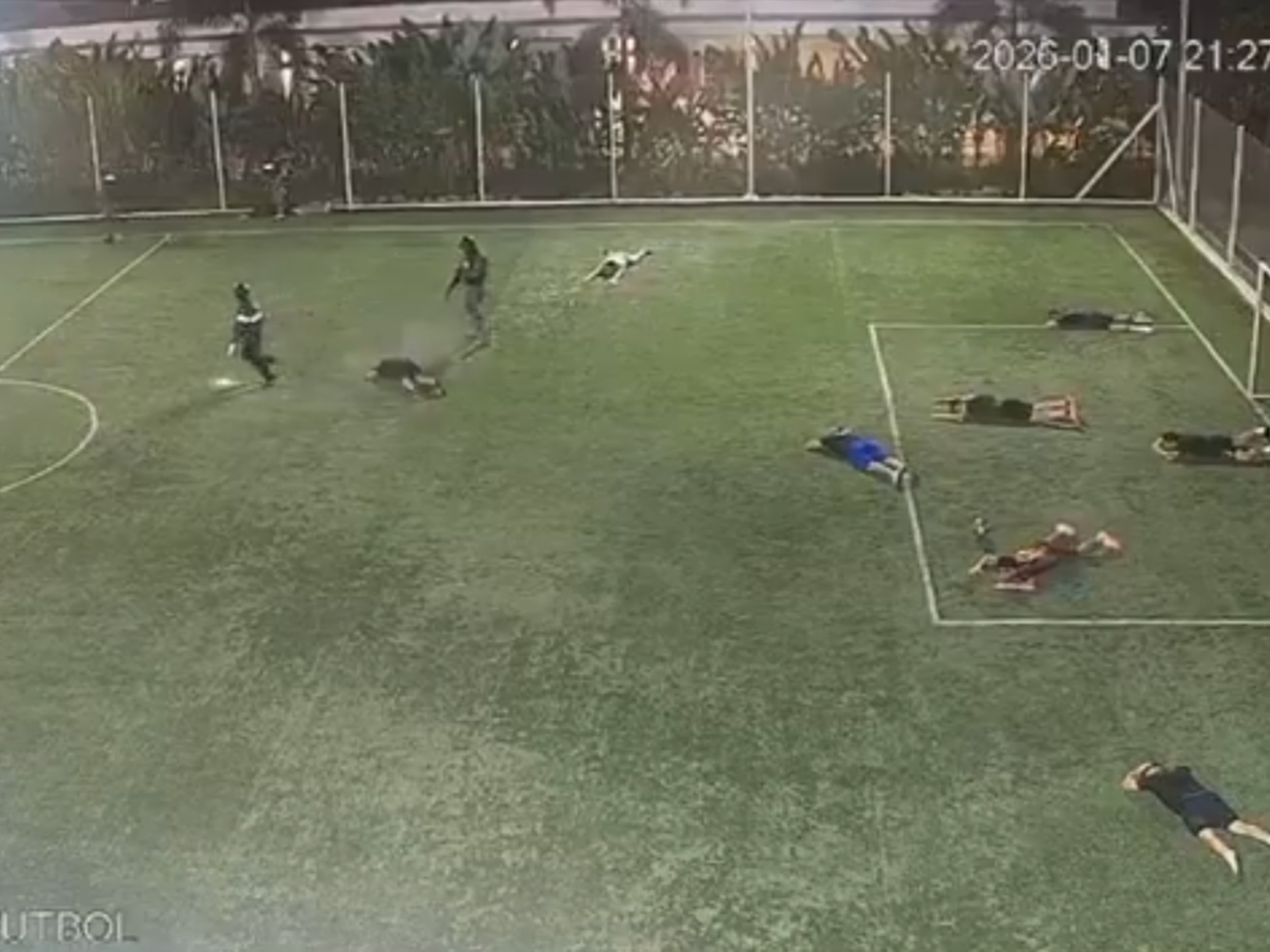 Las imágenes muestran que el ataque se produjo mientras se desarrollaba un partido de fútbol. Un grupo de hombres armados ingresó de forma violenta al área deportiva y obligó a los presentes a tenderse en el suelo para identificar a sus objetivos.