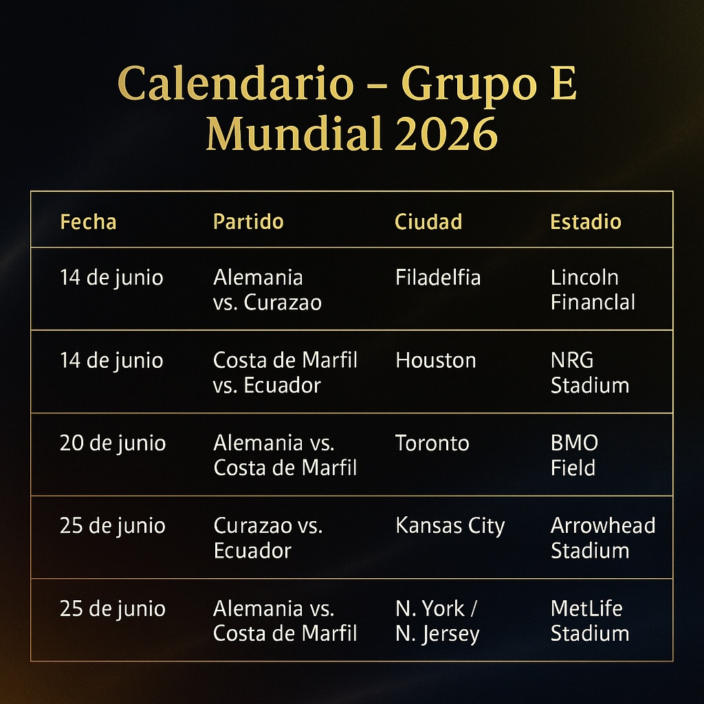 Con Alemania buscando resurgir, Costa de Marfil decidida a sorprender y Curazao motivada por su debut mundialista, el Grupo E promete ser uno de los más intensos del torneo. Ecuador deberá mostrar carácter desde el primer minuto para avanzar en una Copa del Mundo que, con 48 selecciones y tres países anfitriones, será la más grande y exigente de la historia.
